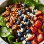 This vibrant and refreshing 15-Minute Strawberry Spinach Salad combines fresh baby spinach, sweet strawberries, juicy blueberries, and tangy feta cheese, all topped with toasted pecans and a homemade balsamic glaze. Perfect as a light lunch or nutritious side, this salad offers a delightful balance of sweet and savory flavors with a luscious balsamic dressing that you can prepare quickly on the stovetop.