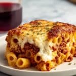 This Beefy Cottage Cheese Baked Ziti is a hearty, comforting Italian-American casserole featuring al dente ziti pasta enveloped in a rich meat ragoût and a creamy cheese mixture of cottage cheese, mozzarella, and Parmesan. With layers of flavorful browned ground beef and pork simmered in a tomato-herb sauce, combined with tender pasta and baked to bubbly golden perfection, this dish is perfect for family dinners or gatherings.