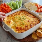 This creamy and spicy Buffalo Chicken Dip is a crowd-pleasing appetizer perfect for game days and parties. Tender shredded chicken is combined with cream cheese, sour cream, tangy buffalo sauce, and cheddar cheese, then baked to bubbly perfection. Served warm with crunchy Fritos, baguette slices, and fresh veggies for dipping, it’s a flavorful and irresistible snack everyone will love.