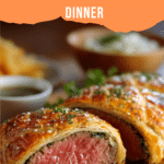 Classic Beef Wellington featuring a tender beef tenderloin wrapped in a savory mushroom duxelles and encased in golden puff pastry, baked to perfection for an impressive and elegant main dish.