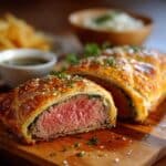 Classic Beef Wellington featuring a tender beef tenderloin wrapped in a savory mushroom duxelles and encased in golden puff pastry, baked to perfection for an impressive and elegant main dish.