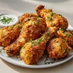Keywords: oven fried chicken thighs, crispy baked chicken, breadcrumb chicken, easy chicken recipe, healthy fried chicken