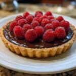 A decadent Chocolate Raspberry Tart featuring a rich chocolate ganache filling nestled in a buttery tart crust, topped with fresh, juicy raspberries for a perfect balance of sweet and tart flavors.