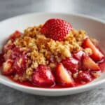- Assemble the Crisp: Spread the strawberry mixture evenly in a baking dish. Sprinkle the oat topping evenly over the strawberries, covering them completely.