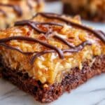 These Easy Samoa Brownies combine fudgy chocolate brownies with toasted coconut, caramel topping, and drizzled melted chocolate to mimic the flavors of the classic Samoa Girl Scout cookies. Perfect for a decadent dessert that is simple to make, these brownies feature a rich base topped with a sweet coconut-caramel layer and finished with a chocolate drizzle.