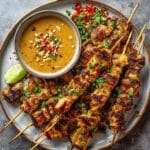 These Honey Garlic Asian Chicken Kabobs feature tender, marinated chicken thighs grilled to perfection with a flavorful blend of oyster sauce, honey, garlic, and ginger. The kabobs are brushed with a tangy, slightly spicy sauce and garnished with fresh green onions and toasted sesame seeds, making them a delicious and easy dish perfect for grilling season or any casual meal.