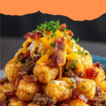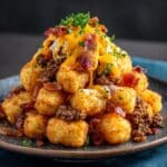 Loaded Tater Tots Appetizer is a crowd-pleasing dish featuring crispy baked tater tots generously topped with melted cheese and crispy bacon pieces. Perfect as a snack or party appetizer, this recipe combines classic comfort flavors with simple preparation.