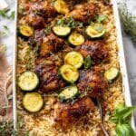 - Assemble in Baking Dish: Pour the basmati rice and sliced zucchini into a 9×13-inch baking dish. Pour 2 cups of water over the rice and zucchini, then add the salted butter on top. Arrange the marinated chicken pieces evenly over the rice and zucchini layer.