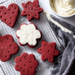 Keywords: red velvet cookies, cream cheese frosting, holiday cookies, cocoa cookies, red velvet dessert